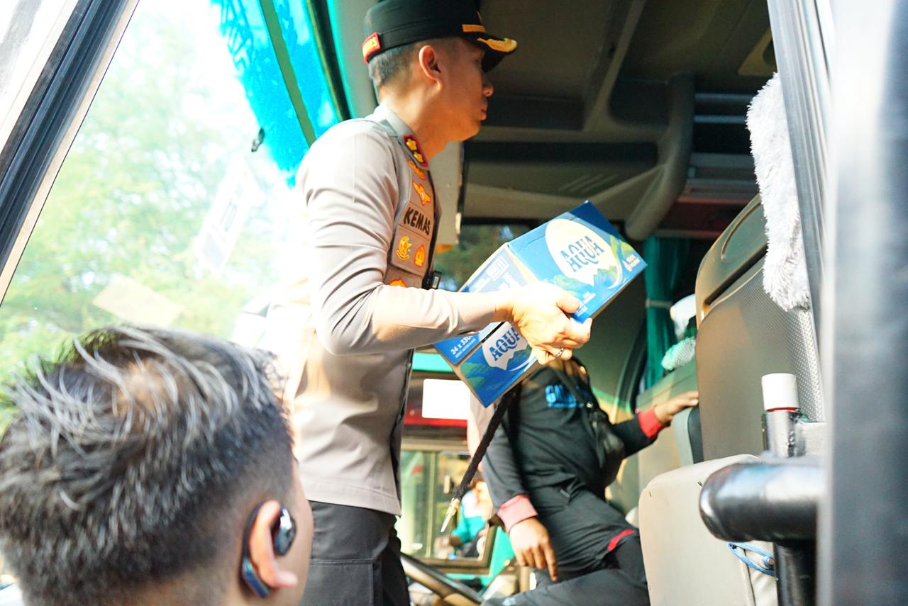 Sebagai bentuk kepedulian dan dukungan terhadap para buruh, Kapolres Cilegon juga membagikan air mineral dan snack sebelum keberangkatan, guna menjaga stamina dan kenyamanan para peserta aksi.