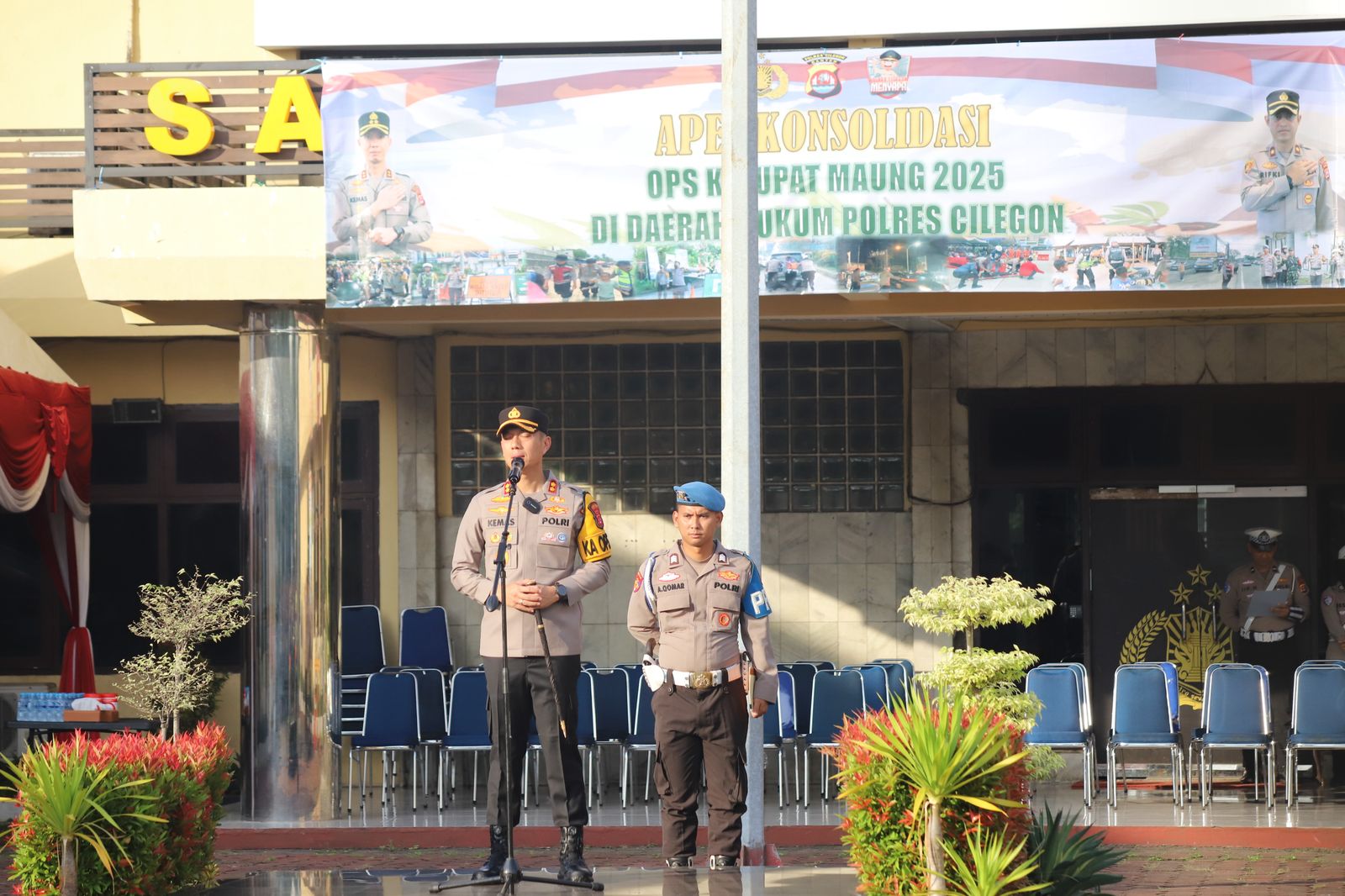 Kapolres Cilegon AKBP Kemas Indra Natanegara, S.H, S.I.K, M.Si dalam Gelaran Apel Konsolidasi Operasi Ketupat Maung 2025 yang berlangsung di Lapangan Satya Haprabu Mapolres Cilegon. (Foto: Bidhumas Polda Banten)
